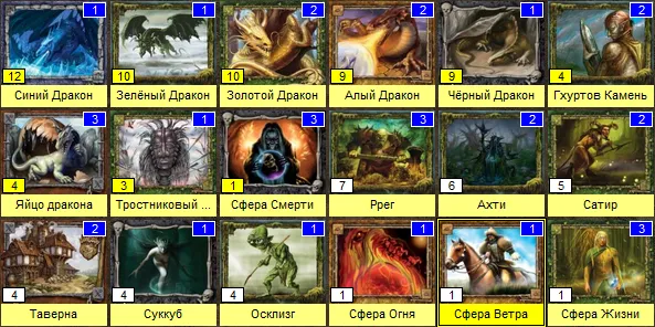- Нейтральные карты, не принадлежащие ни к одной из стихий (фон — коричневый).
